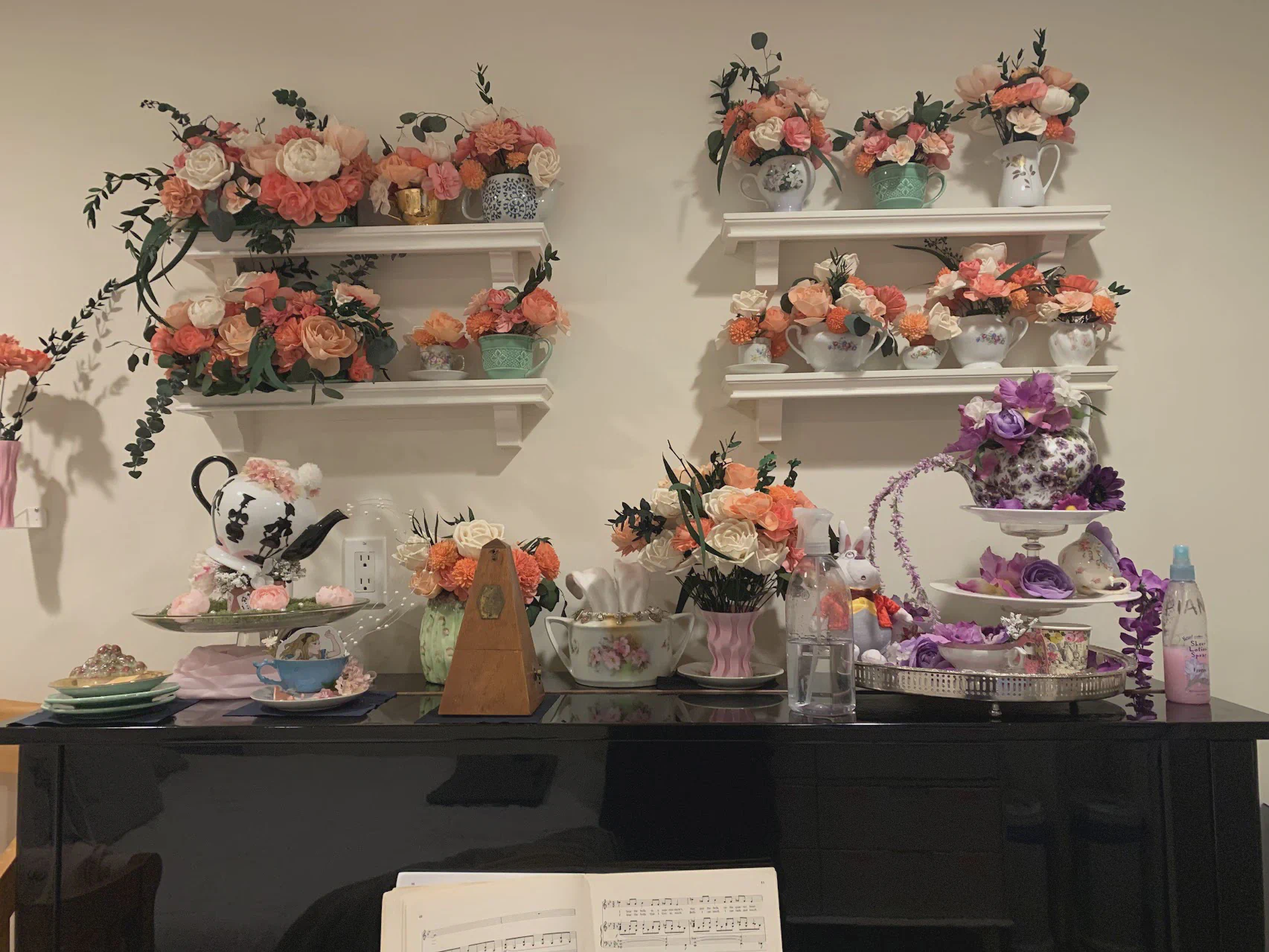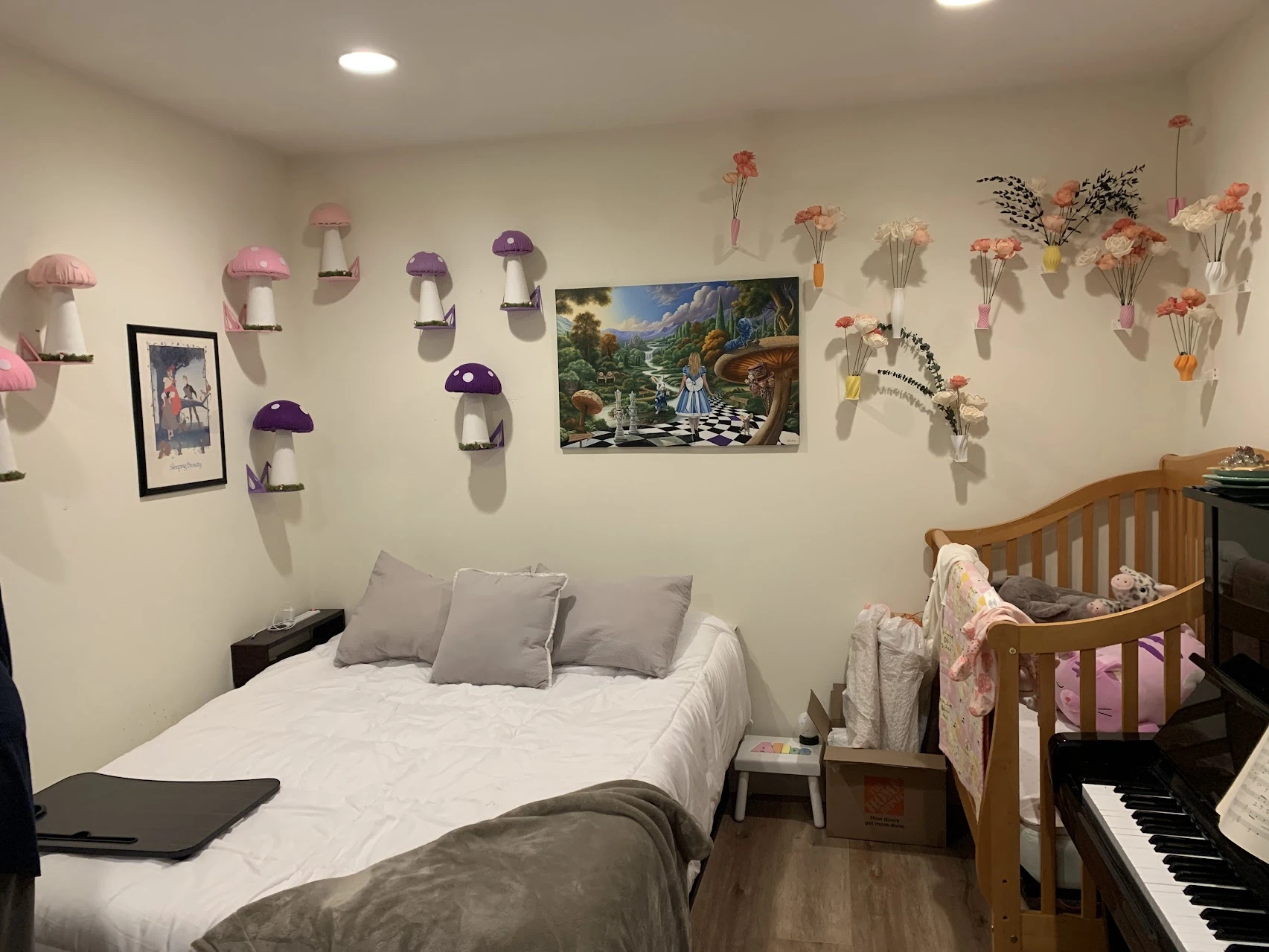 I had a ton of fun kitting out Alice’s nursery wall and the top of the piano we have in there with all kinds of Alice in Wonderland gear from her baby shower and a friend’s wedding. Specifically, the matching color mushroom wall mounts, flower vases, and wall mounts for those. A great mother-in-law made the mushrooms and a great friend custom painted the beautiful centerpiece!