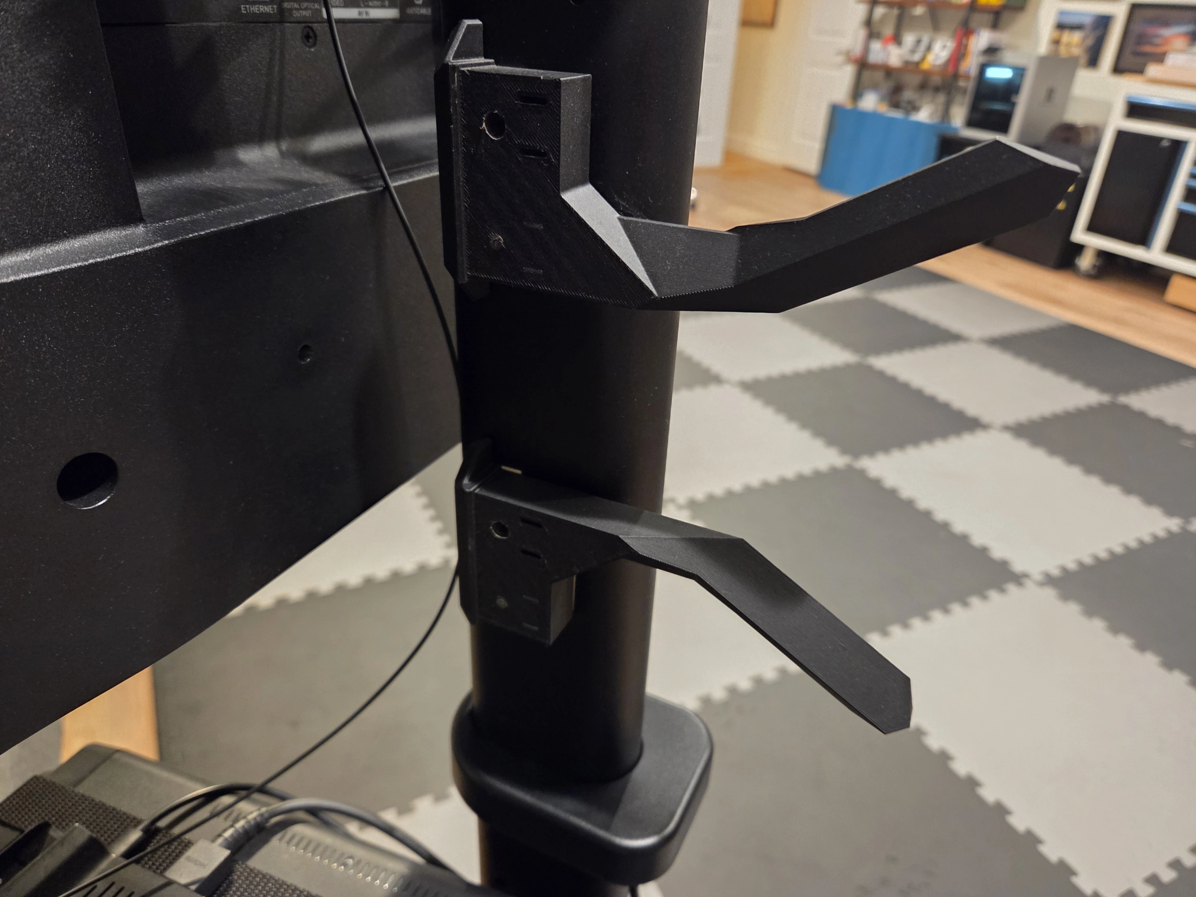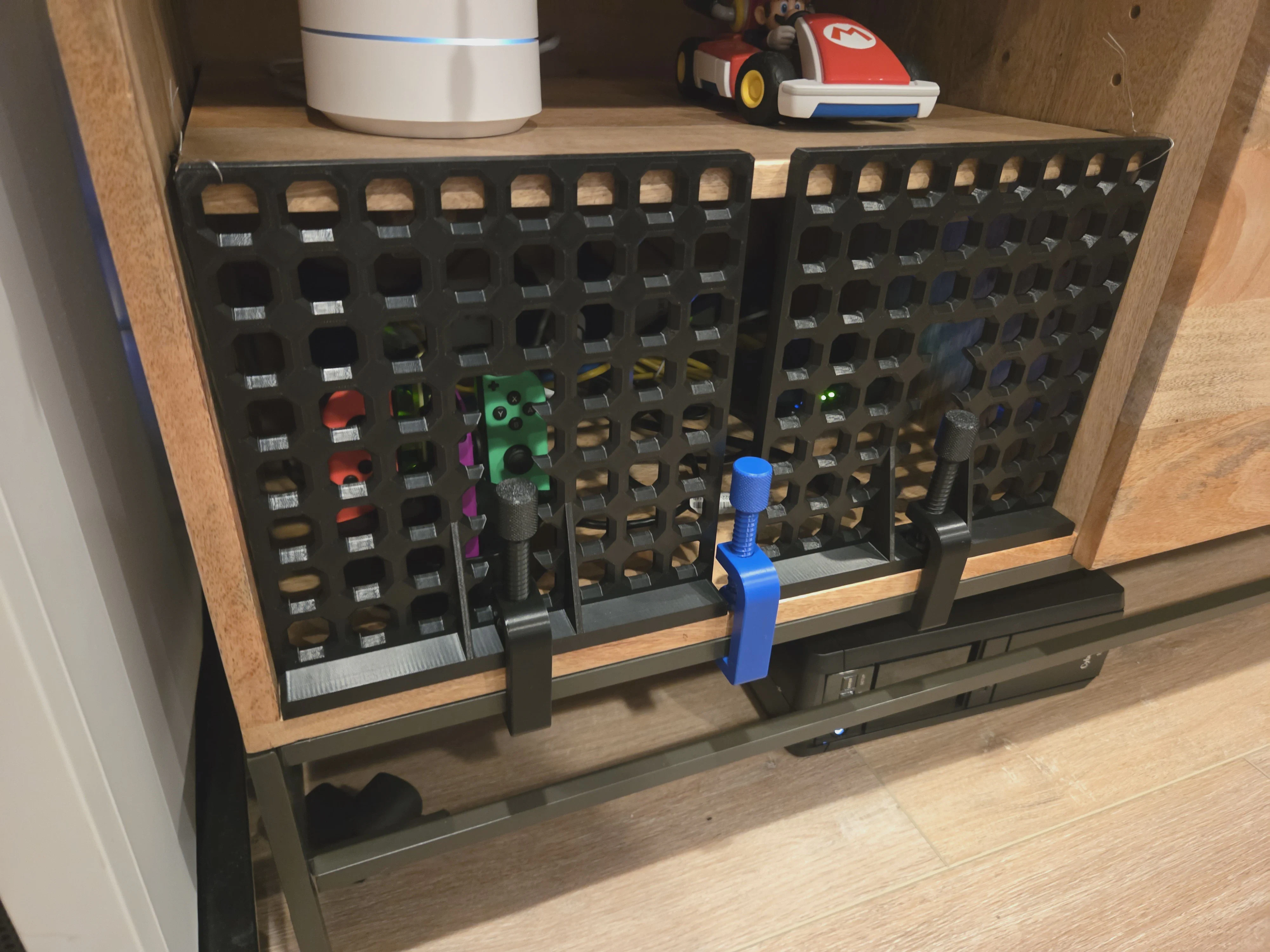 Nothing like some solid CAD modeling for some very specific baby-proofing. We like to “lock” Alice in the living room with us while we’re playing a game or watching something, and she just roams and plays. But she is very attracted to this bottom shelf of our media stand containing router equipment and the Steam Deck - so this custom print, which locks in with 3D-printed G-clamps, protects it. Plus bonus blue decoy G-clamp only tightened enough to be slightly challenging for her to remove.