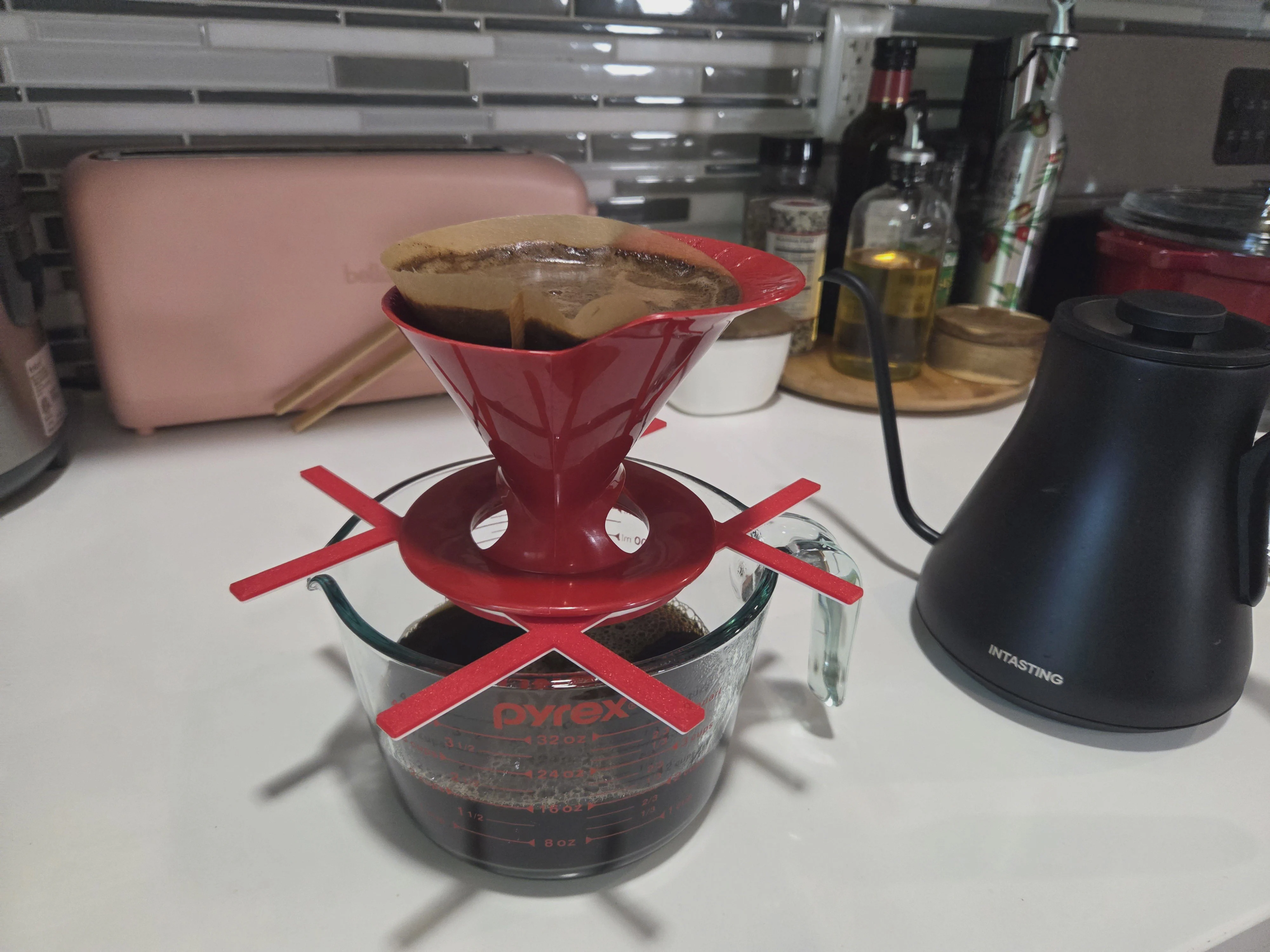 I use this print every single day. I switched to pourover when my favorite actually-good k-cup was discontinued and haven’t looked back since. But usually I make more than one cup or make it for other people, so I want it to drip right into a larger container. This “tic-tac-toe” shaped grid and ring print let me pourover securely on basically any container, like the wide pyrex in the second picture. Printed multicolor in bright red/white to match our kitchen theme.
