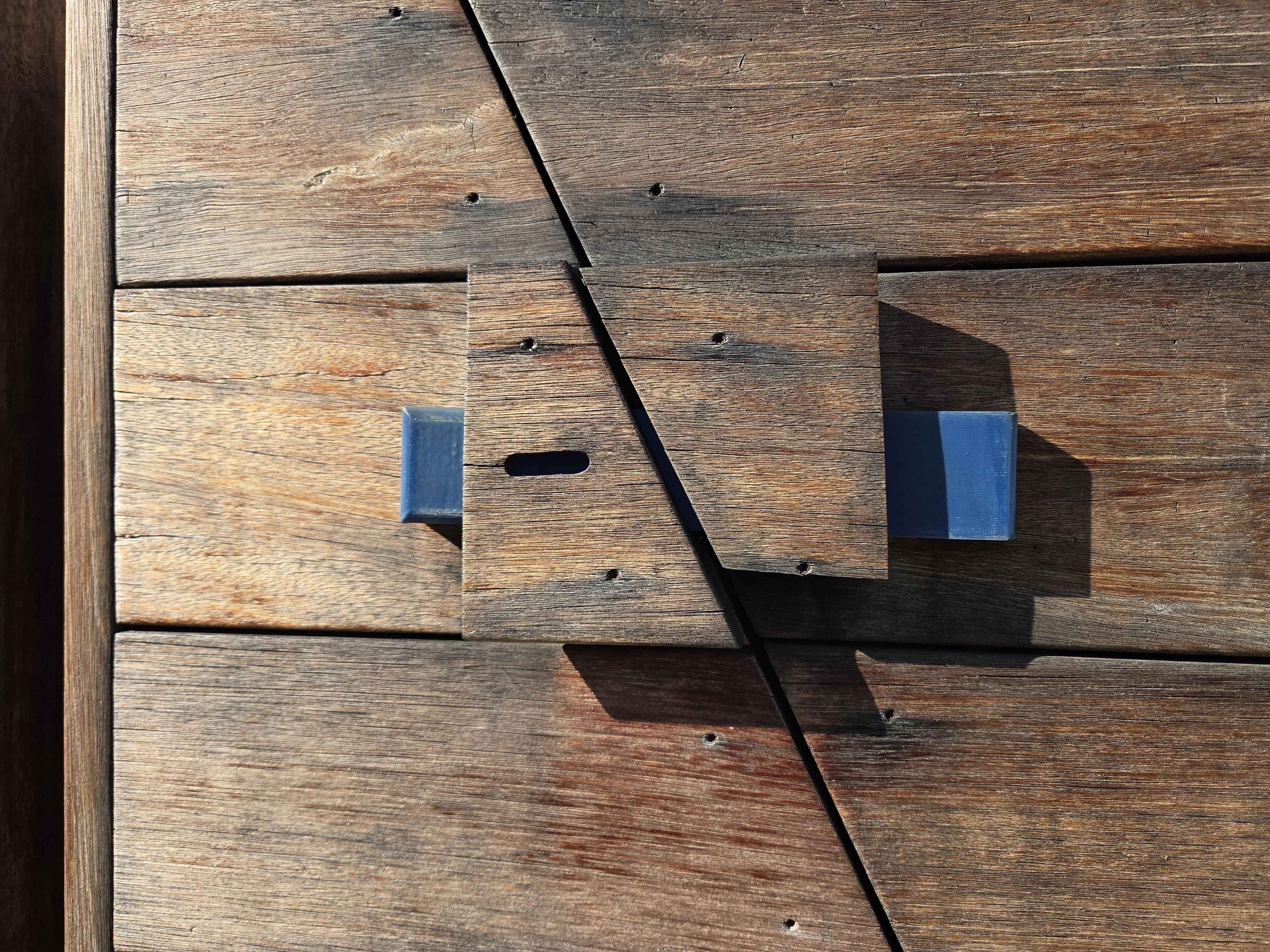 You may wonder how reasonable it is to expect the reinforcement grid above and the other outdoor prints in this post to last, so I present the following 3 prints as evidence they will. A red and blue ABS bracket for a wood rack I built more than 3 years ago, a “Have a tangerine” sign from 3 years ago, and a locking block for a teak cabinet outside, printed in blue and white ASA to replace a teak block that dried up and broke nearly 5 years ago. All three of these live outside 24/7 and see sun and moisture every day. Use the right material and outdoor prints can last longer than treated wood!