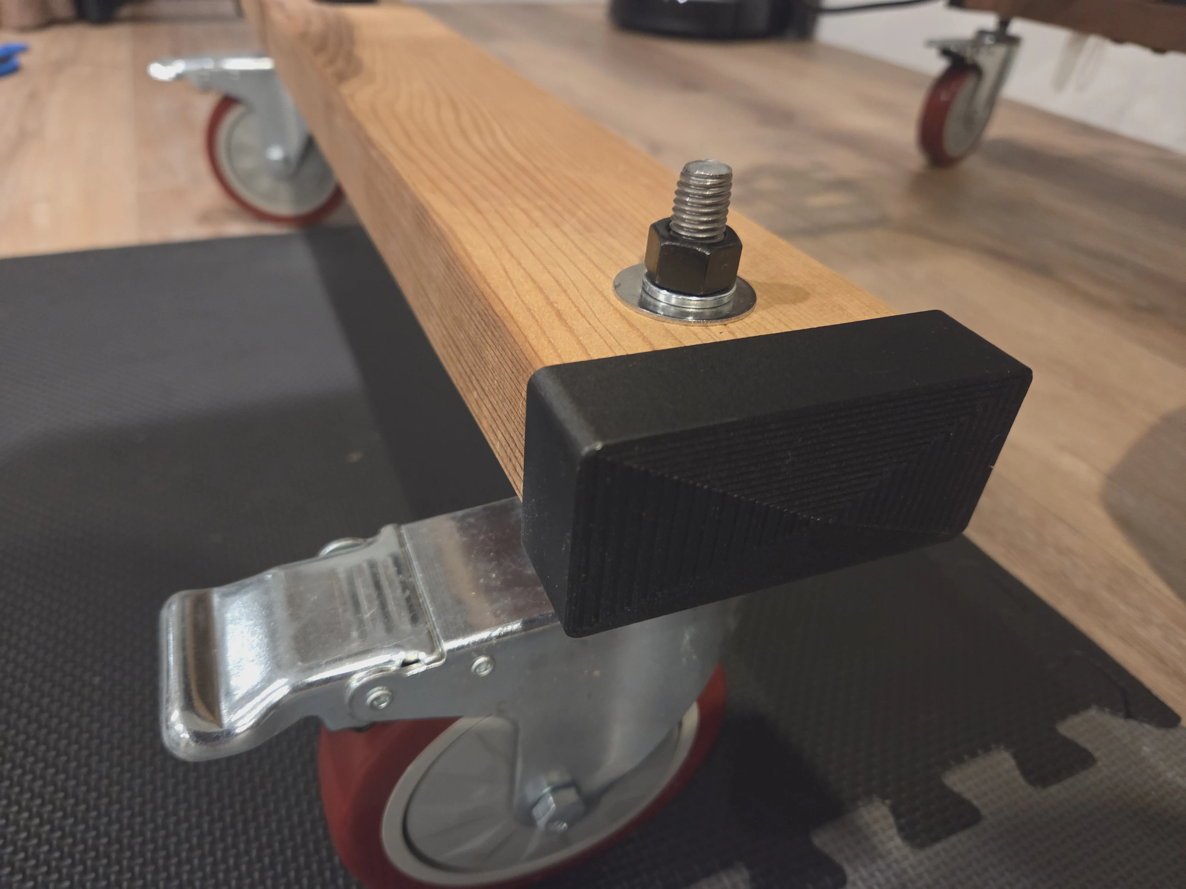 From top left to bottom right: A view of the worksite doing the core woodworking to replace the bent cart legs with wood and refit the giant caster wheels, the final TV cart with the new 2x4 legs, end caps I printed for the legs, a ramp of translucent and white ABS as a ramp up to the doorframe to roll the cart outside (with a rubber wheelchair ramp I have on the outside), and 2 prints to coil the power cable and plug it in while moving it.