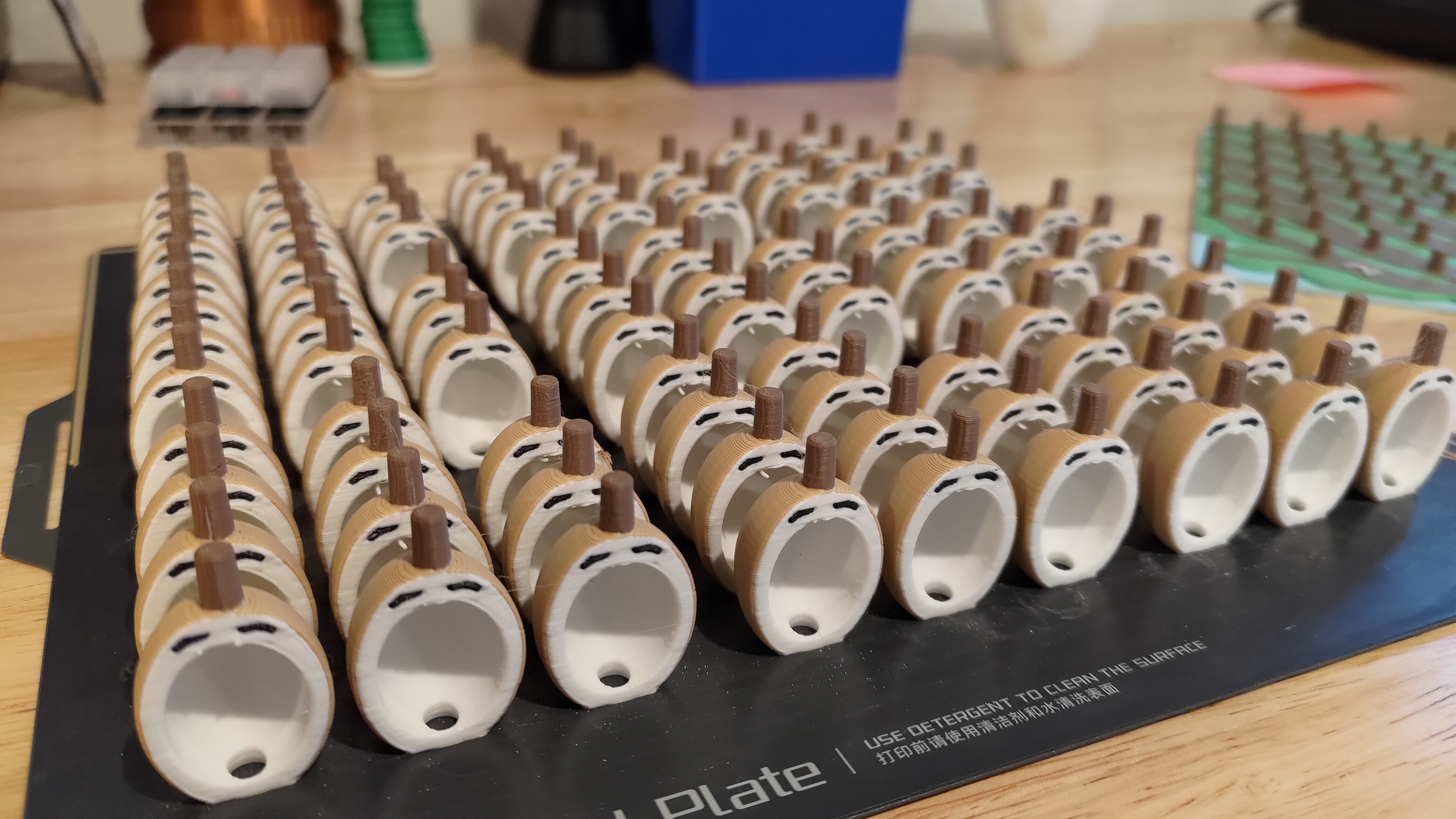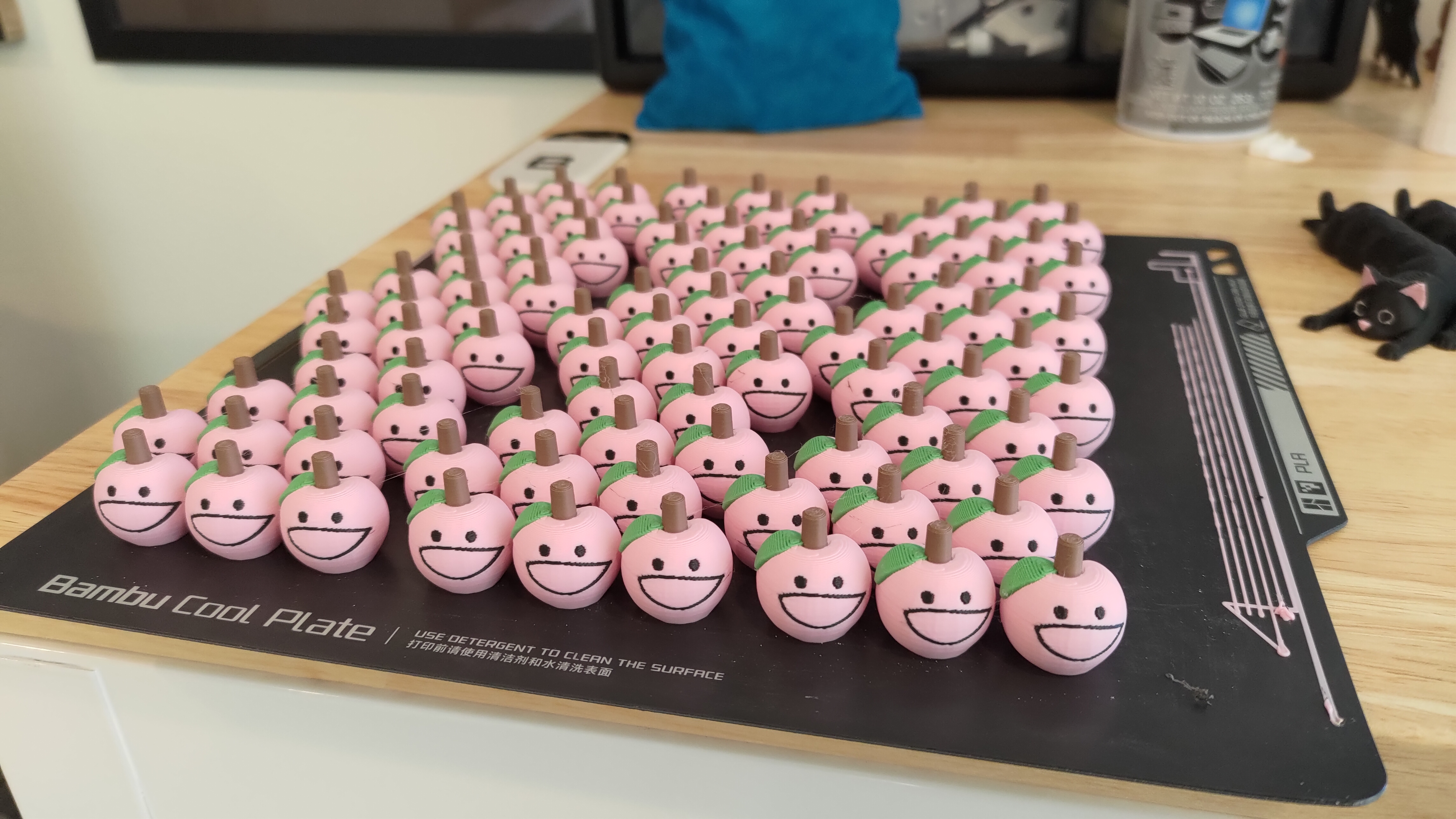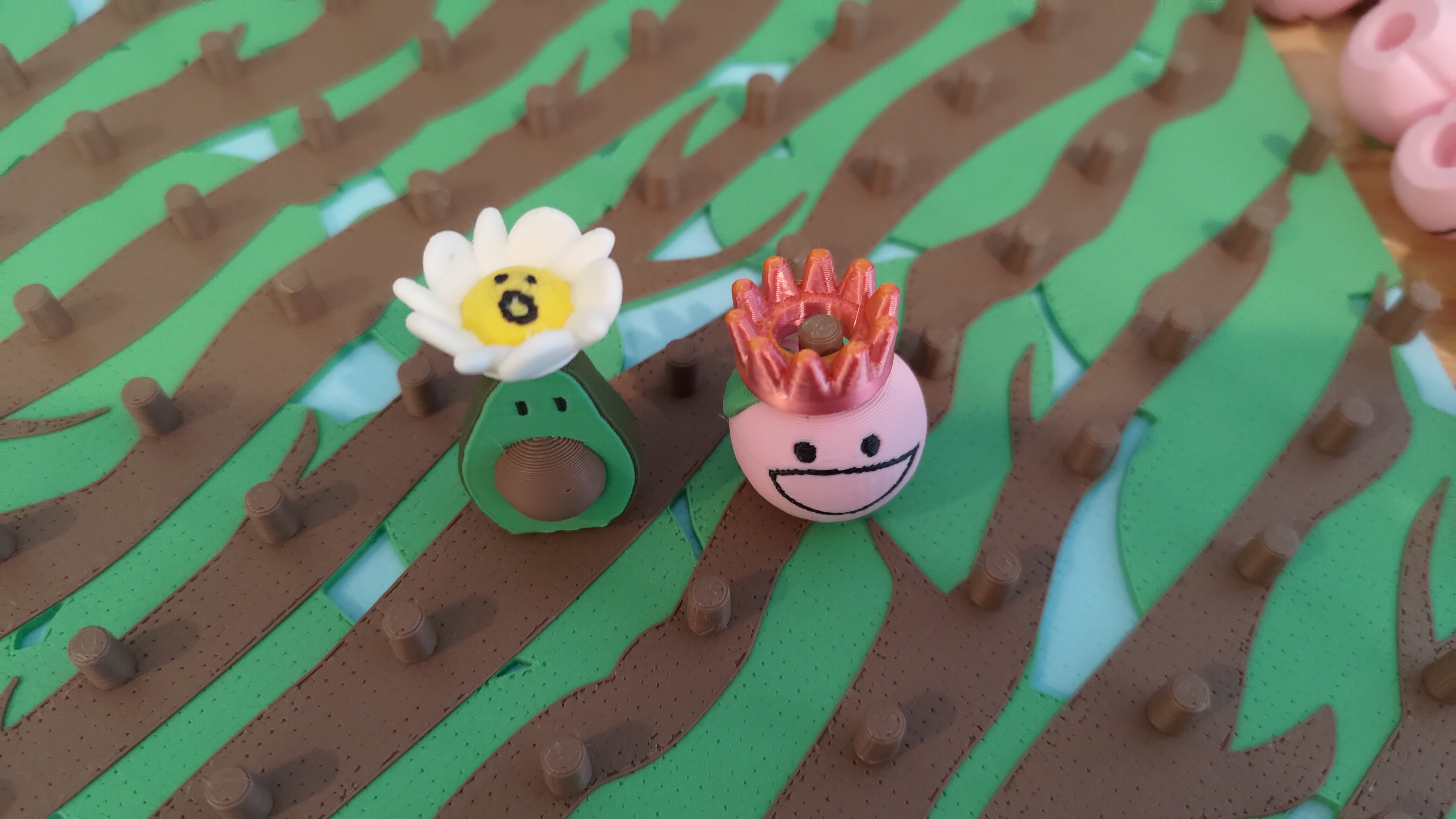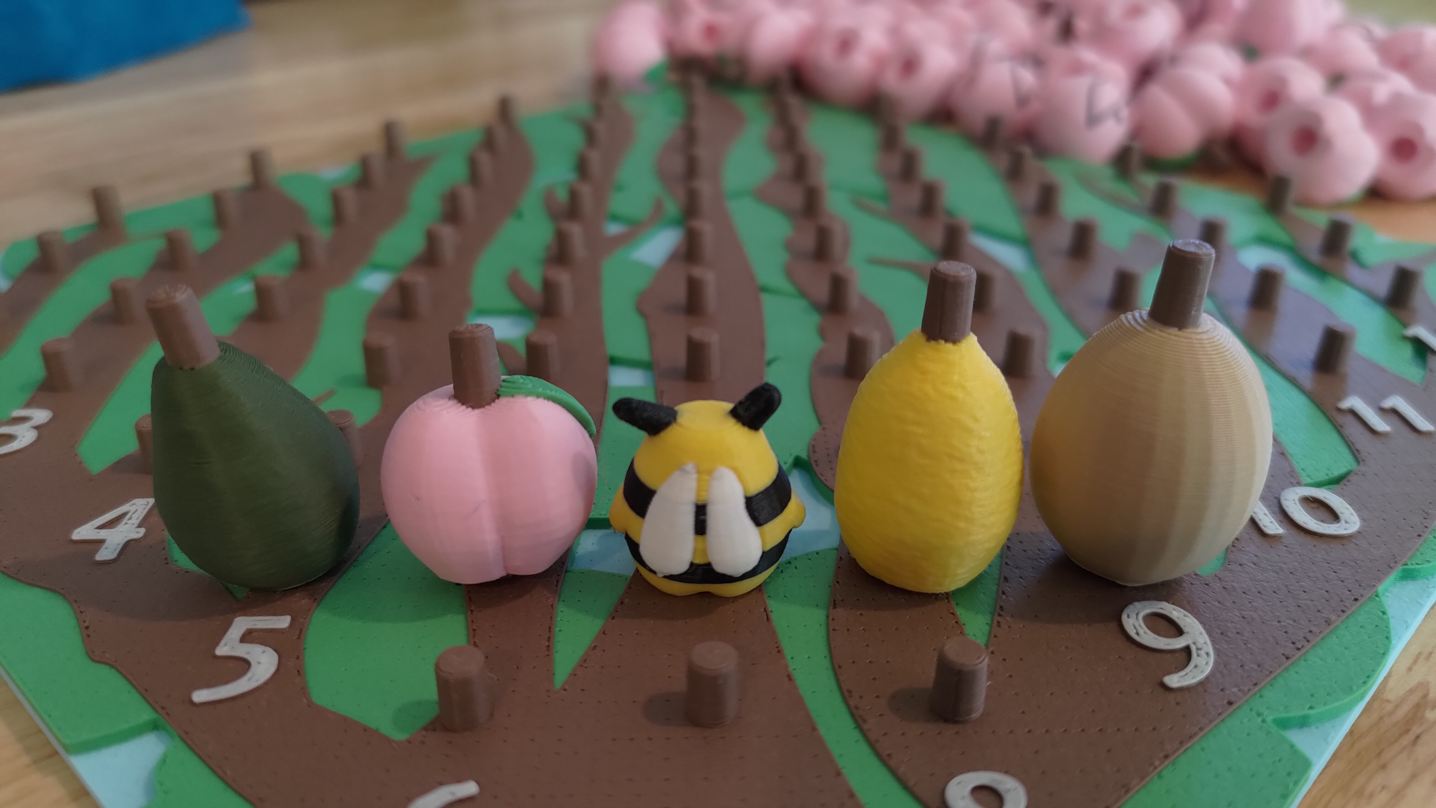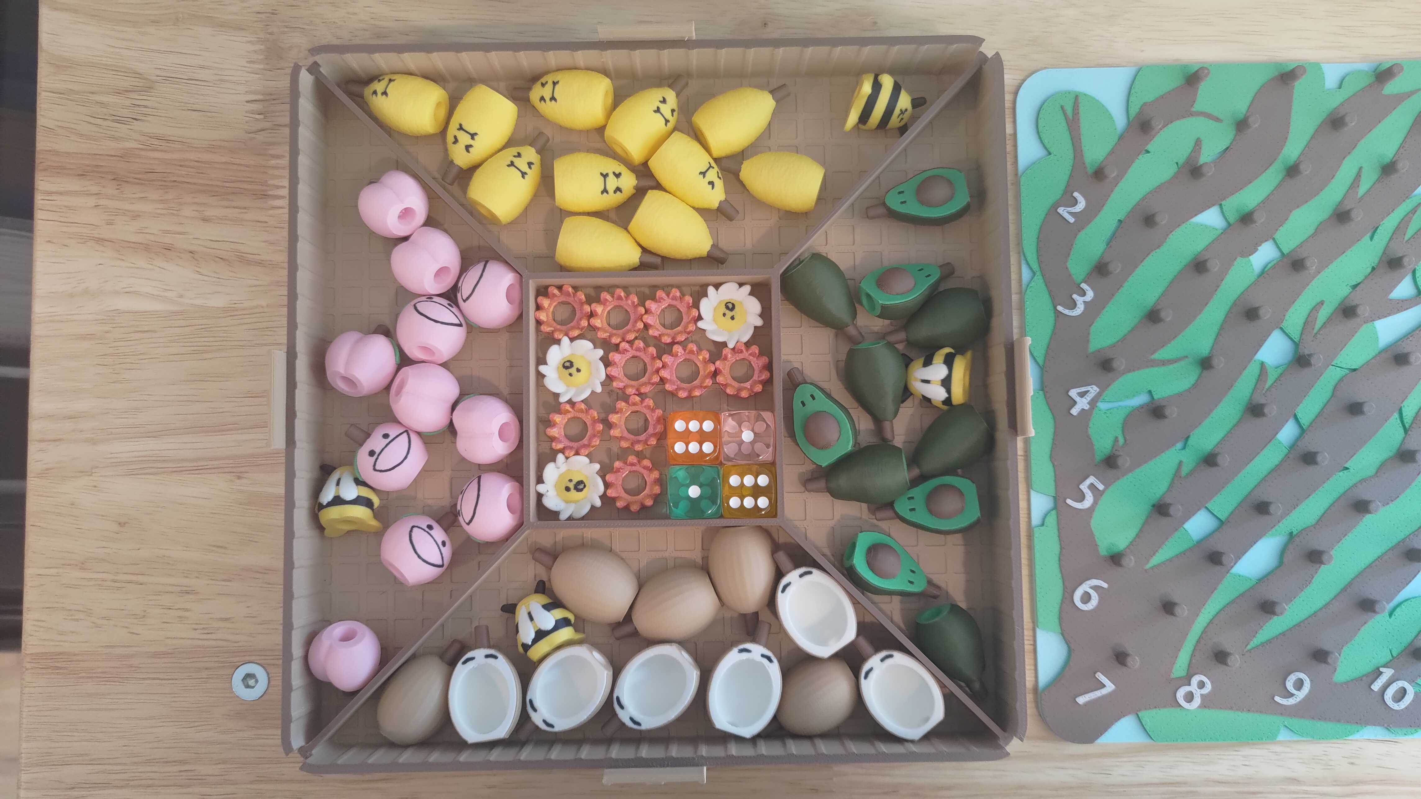 Production is batched with 80 to 150 of each fruit or bee on a build plate, with overall production heavily limited by the game board and latching box each requiring a separate print.