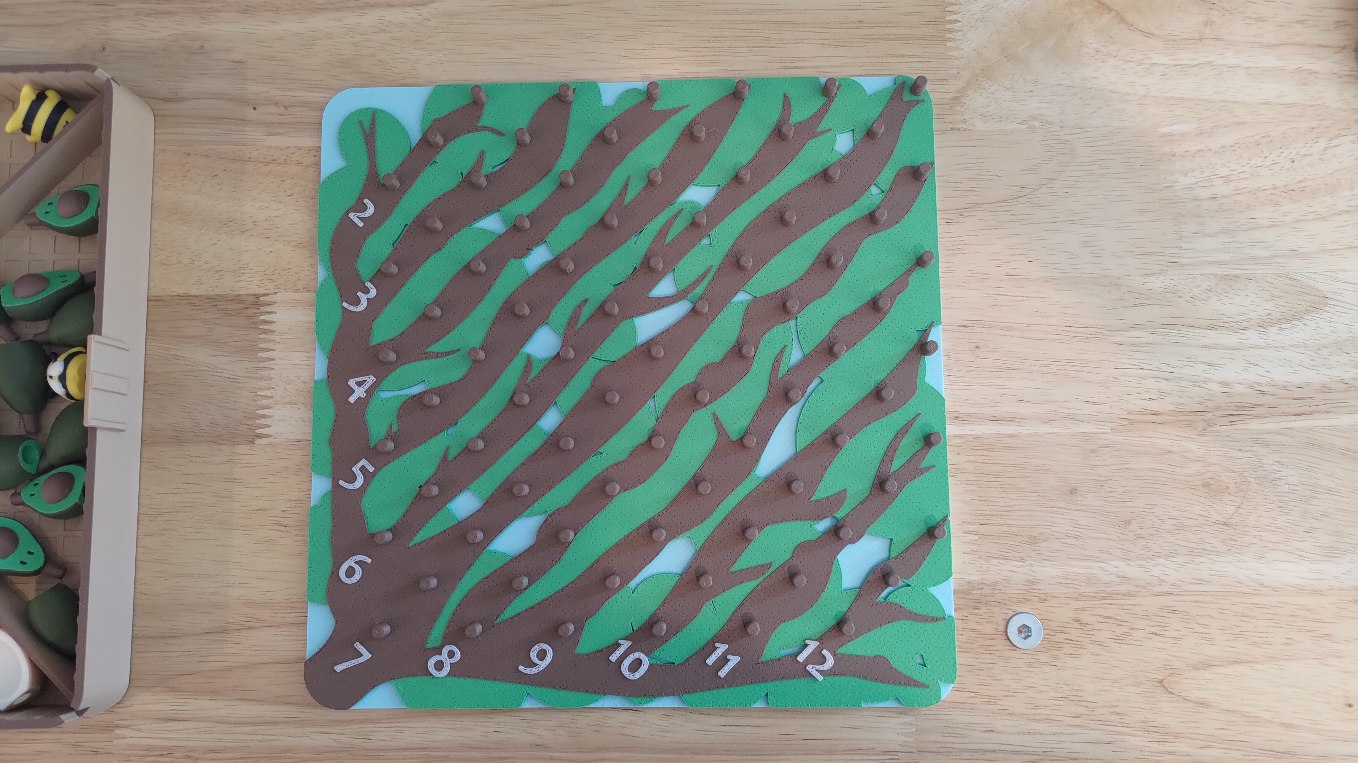 This is a risk-taking game where players compete to take over a tree with their specific type of fruit. Trees and bees are becoming a recurring theme in my games!