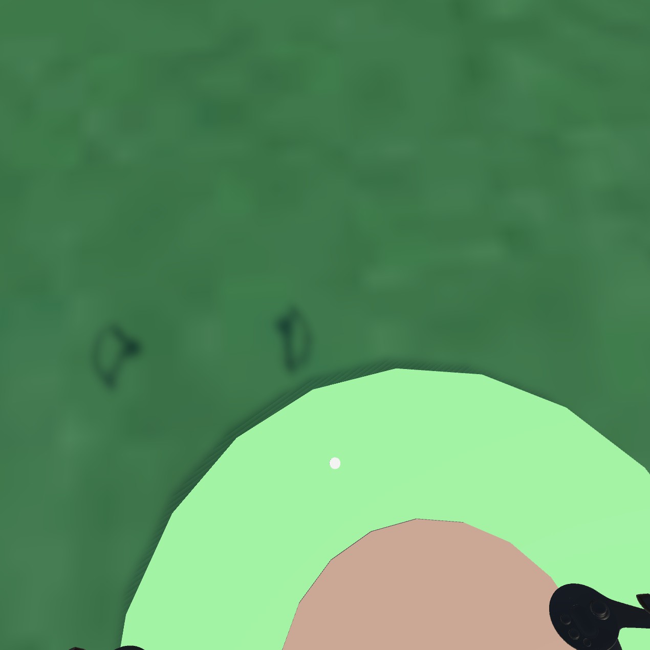 View from the player’s perspective looking at the guides at his feet. With the white dot in the red deadzone, the player isn’t moving. |